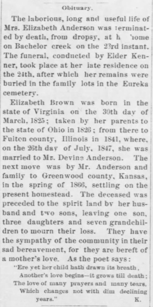 James Brown died in 1867 while visiting his daughter, Elizabeth Anderson, in Greenwood County, KS. His probate records report that he died intestate with a widow and children living in Fulton County, Illinois.