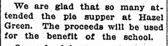 The paper advertised a pie supper at Hazel Green in 1928. Hazel Green was the one-room schoolhouse that Irene attended for the first four years of her education.