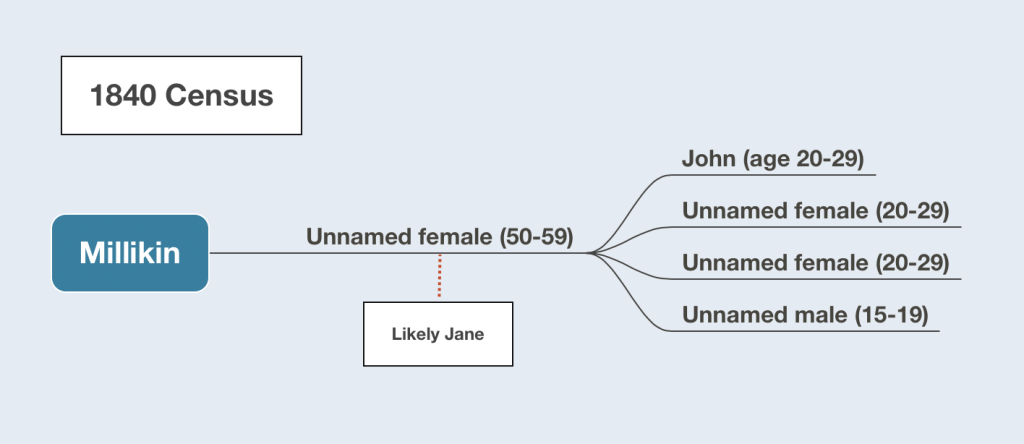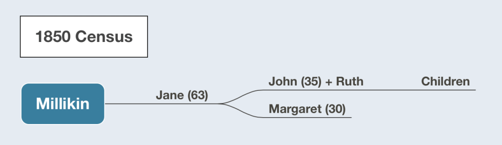 A review of census records for Jane Millikin from 1830-1860 and related names highlight the following familial connections.