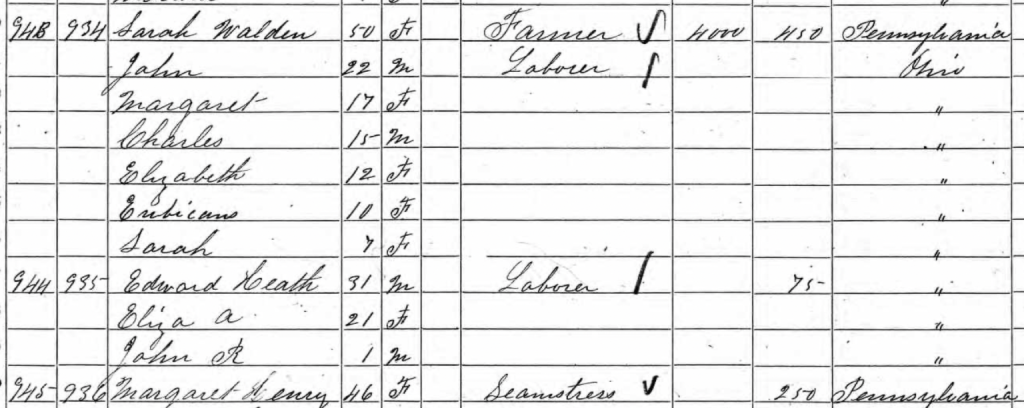 In 1860, Sarah is living near Margaret Henry, a widowed seamstress. This is Margaret Mullikin, who had married James Henry in 1853 and who died in 1858. John and his family with his mother are still living in Liberty TWP.