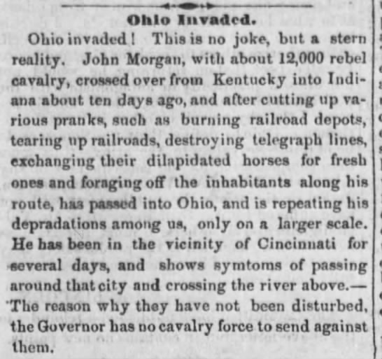 Ohio invaded! This is no joke, but a stern reality. John Morgan, with about 12,000 rebel calvary, crossed over from Kentucky into Indiana about ten days ago, and after cutting up various pranks, such as burning railroad depots, tearing up railroads, destroying telegraph lines, exchanging their dilapidated horses for fresh ones and foraging off the inhabitants along his route, has passed into Ohio, an dit repeating his depredations among us, only on a larger scale. He had been in the vicinity of Cincinnati for several days, and shows symtoms [sic] of passing around that city and crossing the river above.–The reason why they have not been disturbed. The Governor has not calvary force to send against them.