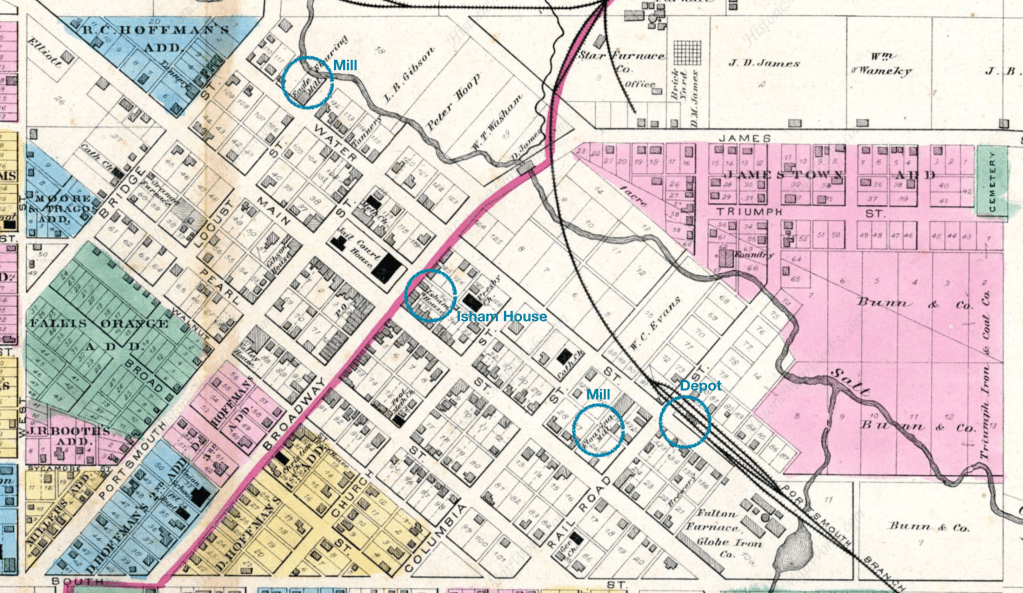 Late in the evening of July 16, 1863, Confederate General John Hunt Morgan entered Jackson with 2,000 cavalrymen, meeting with no resistence. Finding many townspeople assembled, the raiders took the men as prisoners and held them at the fairground. They then foraged the town at will, taking food and all available horses. The raiders also burned the Cincinnati and Marietta Railroad depot and destroyed the office of The Standard, the Republican newspaper. Morgan made his headquarters at the Isham House, directly across the street from this marker. He continued eastward on the afternoon of July 17. Strongly divided politically during the Civil War, Jackson received no speical consideration by Morgan. Both unionists and “Copperheads” (southern sympathizers) suffered equally.