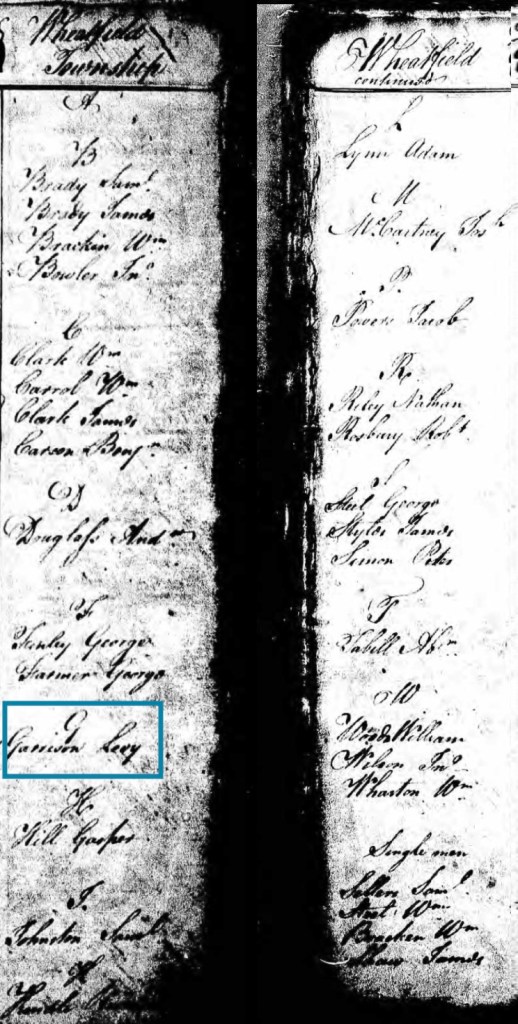By 1786, Levi Garrison appears on the Pennsylvania Septennial Census for Wheatfield Township.
