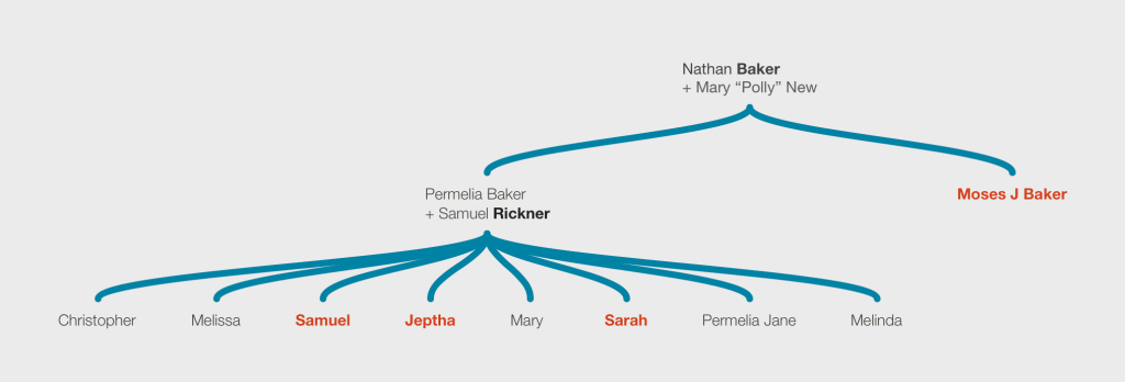 Samuel Rickner married Permelia Baker in 1832. Rickner, an immigrant from Switzerland, married into a slave-holdinng family that had migrated to Missouri from Kentucky and who in previous generations had migrated from the Albemarle Sound region of North Carolina, all slave-holding states.
