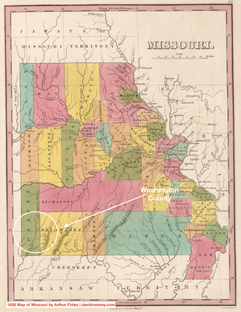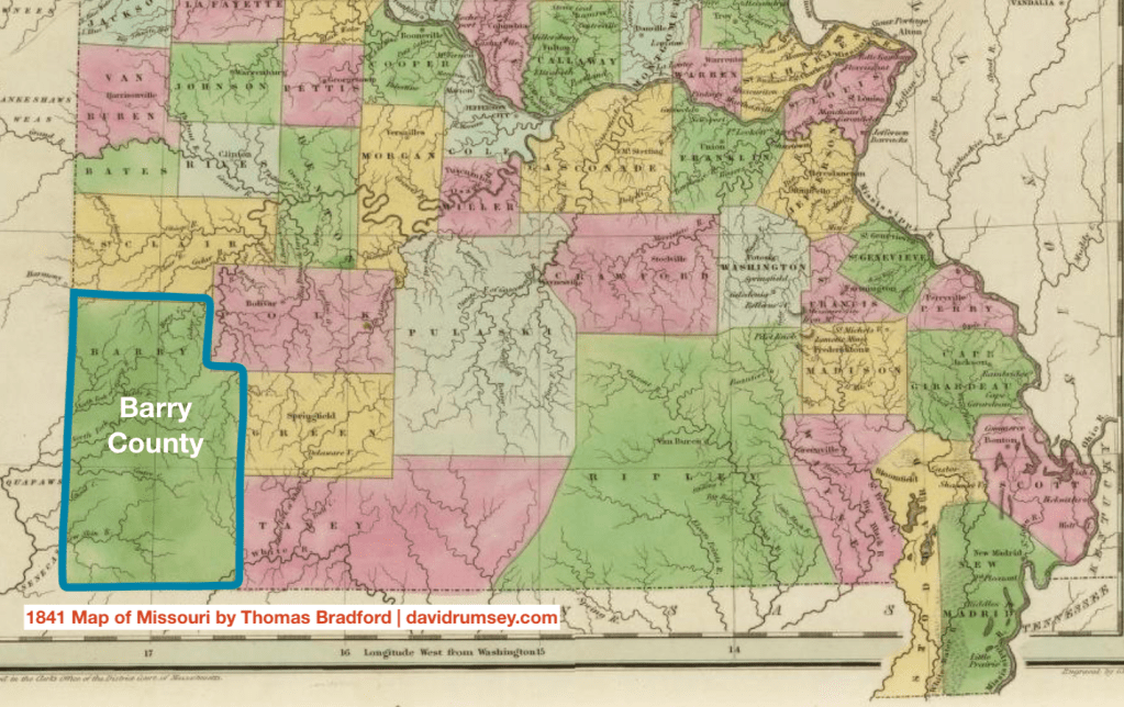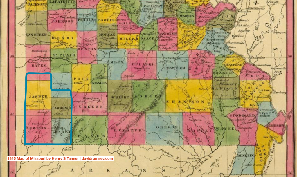 In the mid 1830s, the Rickner family and Permelia’s brother, Moses J Baker migrated again, leaving Washington County, Missouri for southwestern Missouri. The land was still predominately occupied by American Indians who had been removed from their homelands in the east. In 1837, rumors spread the the Osage “were coming” and the Missouri government sent a sizable militia to the area. The Osage, out-numbered, surrendered. By 1840, the land would be organized into counties, that were rapidly subdivided into smaller counties as the Euro-American population grew and the American Indian population was killed or removed into the Indian Territories (Kansas & Oklahoma).