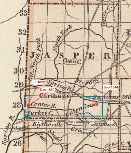 Moses J Baker, Permelia’s brother, married Amanda Melugin in Barry County in 1838. Three Melugin families were living in Marin Township, Newton County (immediately south of Jasper County) in the 1840 census. Joseph appears to the patriarch with his two sons: Samuel and Thomas. Land patents given by the US Government in the 1840s and 1850s specify acreage in Jasper County and in the 1850 Census, the Melugins are living near Sarcoxie, Jasper County, Missouri. Sarcoxie is named as one of the earliest Euro-American settlements in Jasper County and is said to be named after an Osage chief. The Melugins had migrated to southwestern Missouri from Tennessee. Many of the Euro-American settlers had come from Kentucky and Tennessee like the Bakers and Melugins.