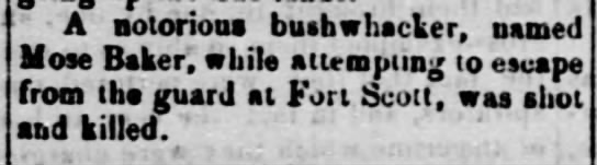 The prisoners were taken to Fort Scott, where he died the next fall. The Independent of Oskaloosa Kansas reported that “A notorious bushwhacker, named Mose [sic] Baker, while attempting to escape from the guard at Fort Scott, was shot and killed.” [Sept 26, 1863]