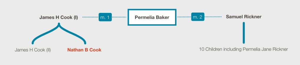 Nathan B Cook was the second son of Permelia (Baker) Cook Rickner. Permelia had married James H Cook (I) in Washington County, Missouri in 1828. In the 1830 US Federal Census, they were enumerated in Crawford County, Missouri, a neighboring county in Meramec Township, created in 1829 from Gasconade county.