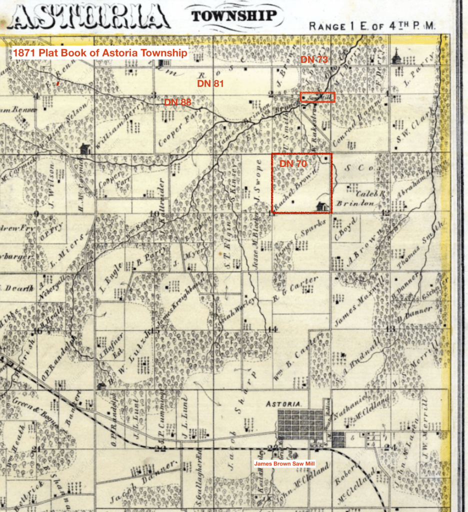 James Brown (ca. 1802-1867) is said to to have built the first saw-mill in Astoria, Fulton County, Illinois. The History of Fulton County details that “The first saw and grist-mill was built by James Brown. Mr. Brown and others ran it for about twelve years, when it fell into the hands of H. L. Mooney.” Astoria was established in 1837 and Brown migrated to Fulton County in 1841 according to his daughter’s obituary. The year prior, in Belmont County, Ohio, the 1840 US Census marked that Brown was engaged with manufacturing and trade, suggesting that Brown was in the lumber industry in Belmont prior to moving to Fulton County.