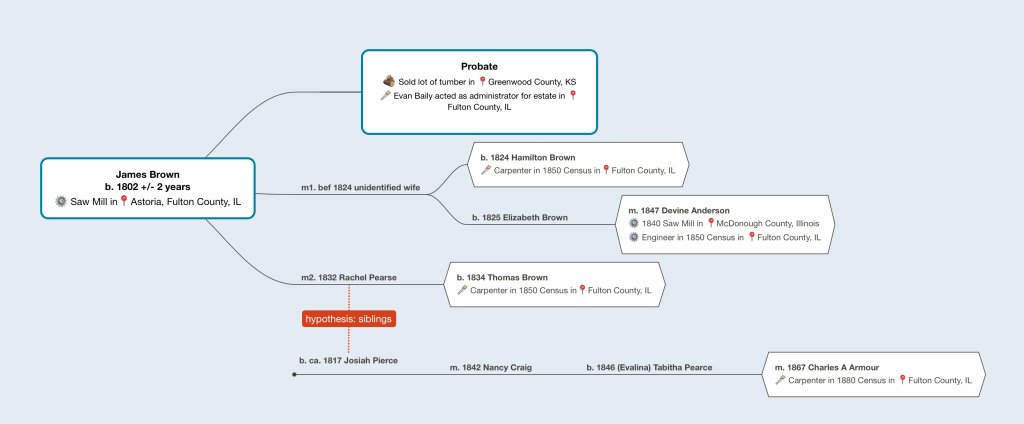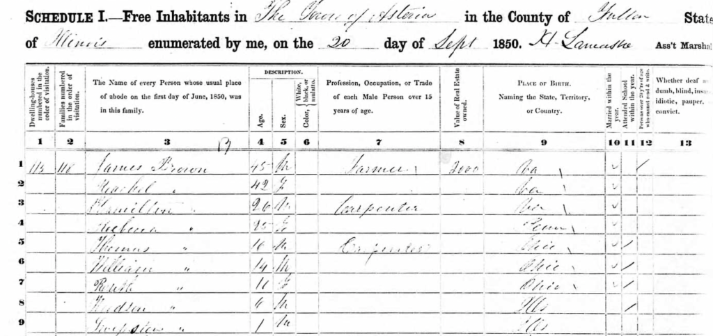 In 1847, Elizabeth Brown, the daughter of James Brown and his first wife, married Devine Anderson in Fulton County, IL. Devine Anderson is recorded in the History of McDonough County, Illinois on page 818 as having built a saw mill with J. O. C. Wilson on section 14 of Chalmers Township in 1840. More details about the mill can be read about in this post. McDonough County borders Fulton County on the west. In the 1850 census, Anderson and his wife, Elizabeth, are recorded as living in Astoria Township of Fulton County. Anderson is recorded as an engineer; listed on the same page is Hamilton Brown, in the household of John W Smith. Both Smith and Hamilton are carpenters.