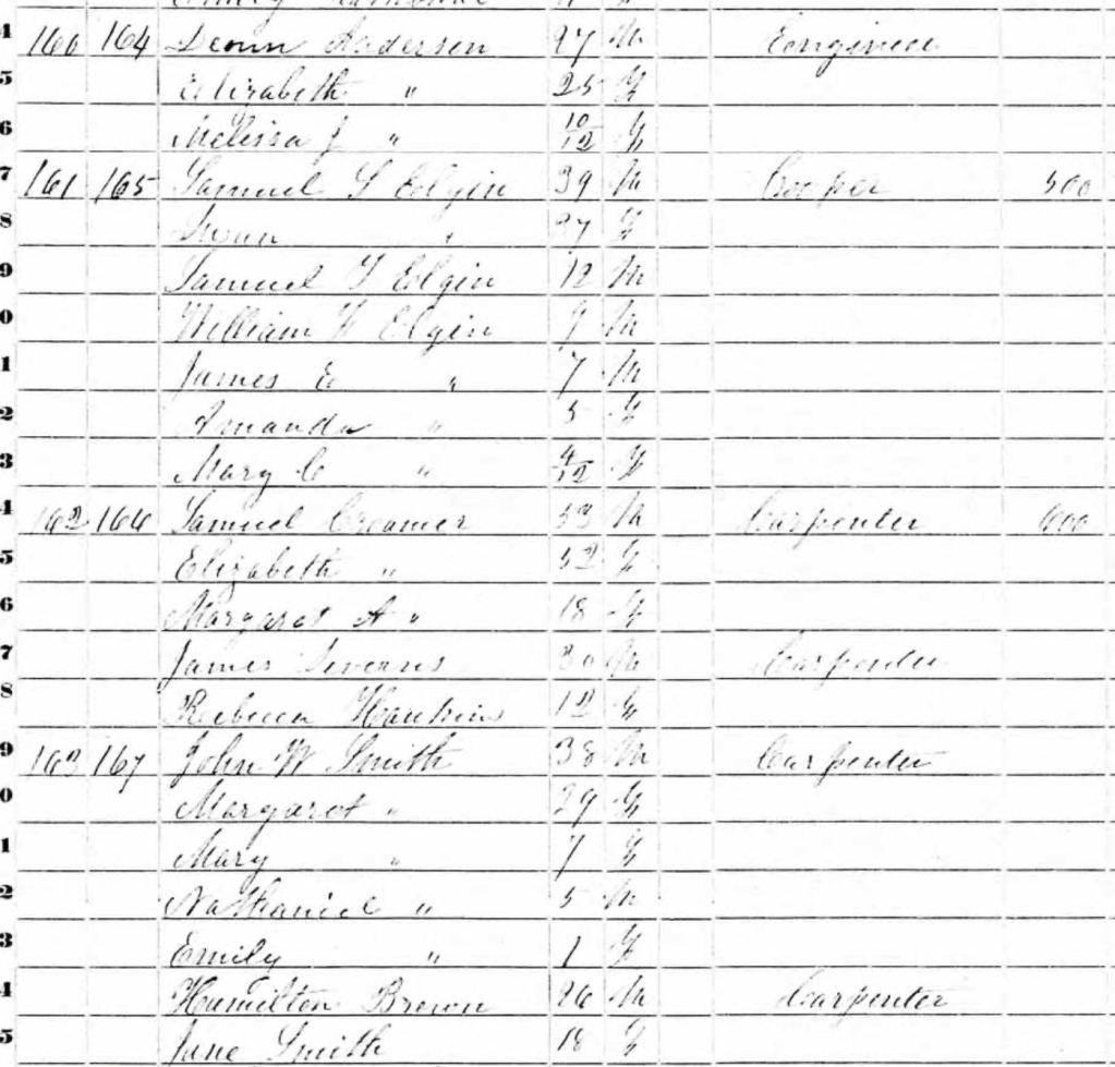 In the 1850 Census, James Brown and his household is listed twice in the census. The household enumerated as Dwelling 115 shows Brown and his sons (Hamilton and Thomas) with an occupation. While Brown is listed as a farmer, his sons are listed as carpenters. (Hamilton is also listed in the household of John W Smith as a carpenter). This is contrasted with the household enumerated as Dwelling 55; Hamilton is omitted and both James and his son Thomas are listed as farmers.