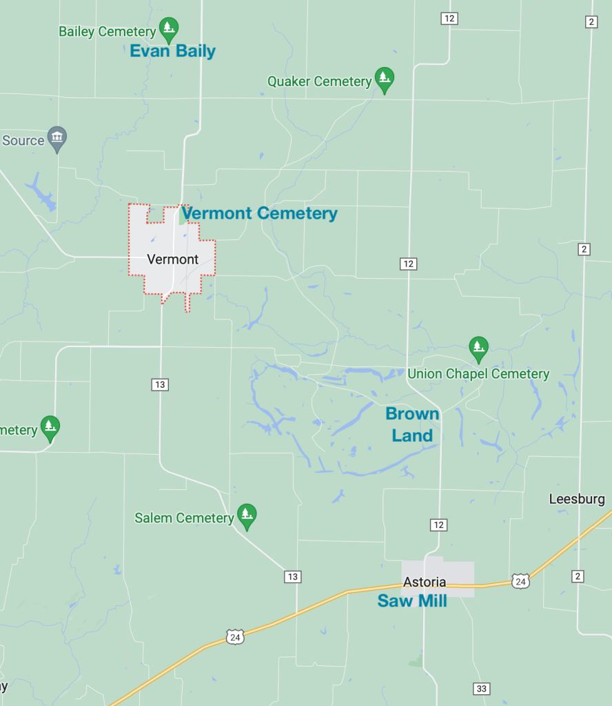 In 1868, Evan Baily served as the administrator of James Brown’s estate. He was a carpenter who lived in the neighboring township in Fulton County, Illinois. On the 1871 Map of Vermont Township in the Atlas for Fulton County, his land is marked north of the village of Vermont. Today, it is in the general location of the Bailey Cemetery, where he is buried. James Brown’s wife and children (including Hamilton) were buried in Vermont Cemetery.
