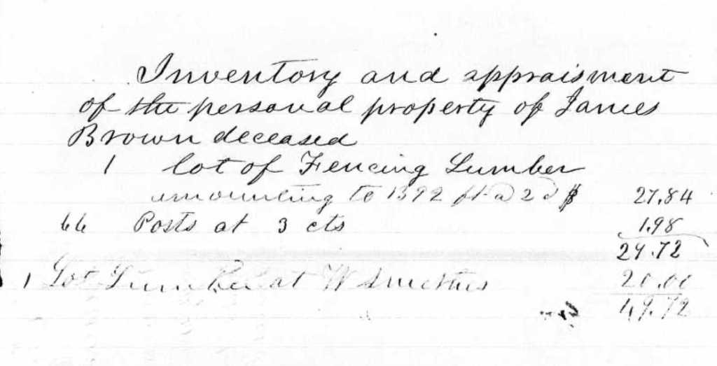The probate records for James Brown includes his inventory of property in Kansas at the time of his death, which included lumber and posts. Presumably he brought the labor to help his daughter and son-in-law in their new homestead near Bachelor Creek in Greenwood County, Kansas.